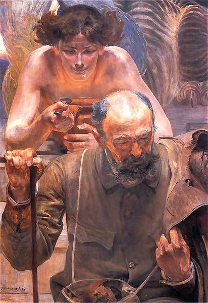 This is Jacek Malczewski’s *Self-Portrait*, painted at an unknown date, currently held in a private collection. Malczewski lived during a tumultuous period in Polish history, marked by partitions and a struggle for national identity. His art often grapples with themes of patriotism, mythology, and personal experience. In this image, the artist portrays himself with a melancholic expression as an allegorical figure, an angel, adjusts a blue ribbon around him. This ribbon, adorned with Polish motifs, may symbolize the complex ties that bind the artist to his homeland. The angel, a recurring figure in Malczewski's work, might represent inspiration or a spiritual guide, or perhaps an aspect of the artist's own psyche. Malczewski once said, “An artist must search for symbols that contain the soul of the nation.” Through his self-portraits, he explores the intersection of his identity as an artist and as a Pole, inviting us to consider the burdens and responsibilities that come with cultural and national consciousness.