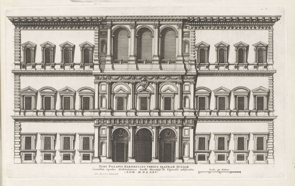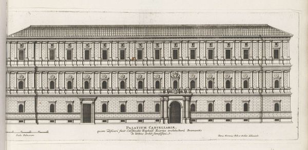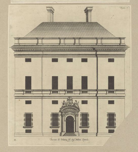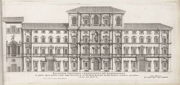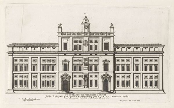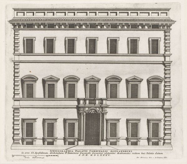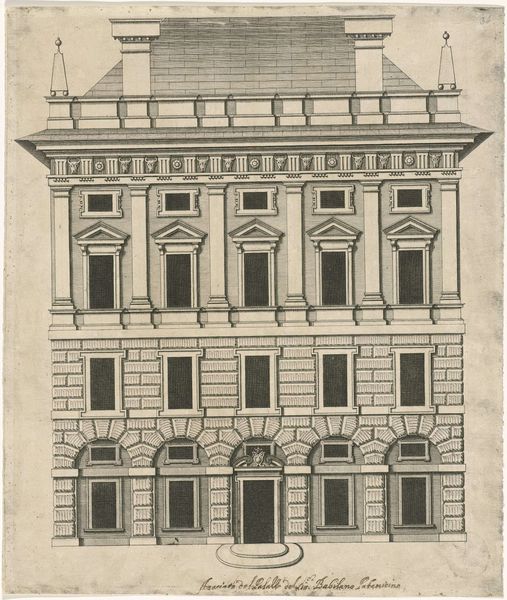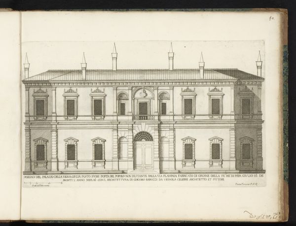 Editor: This is Giovanni Battista Falda's "Facade van Villa Giulia te Rome," created around 1655. It’s an architectural drawing, etched in ink on paper, presenting a very precise, almost sterile view of the villa. What stands out to me is how the architectural details seem to almost float on the page; what story do you think this facade is trying to tell? Curator: Well, let's consider the context. This drawing was created during the Baroque period, a time of significant papal authority and urban renewal in Rome. Falda's print functions, in part, as propaganda. By showcasing the Villa Giulia's perfect symmetry and classical motifs, he is participating in the construction of Rome as a renewed center of power and artistic patronage. Notice how the inscription directly below the image associates Pope Julius III to the villa. Editor: So it's less about representing the villa realistically and more about promoting a certain image of Rome, is that right? Like, this idealized image speaks volumes about the aspirations of the church at that moment? Curator: Exactly. The villa itself was conceived as a space for leisure and entertainment for the Pope. So in rendering it as an ordered architectural plan, the print mediates the lived experience, reinforcing social hierarchies and aesthetic ideals. How might viewers at the time have experienced this image differently compared to today? Editor: That's interesting, it definitely changes how I look at the piece. I guess I was too focused on my own interpretation, it's easy to overlook how an artwork functions within its historical moment. Curator: Precisely. By considering the social, cultural, and institutional contexts surrounding art, we uncover hidden narratives and power dynamics.