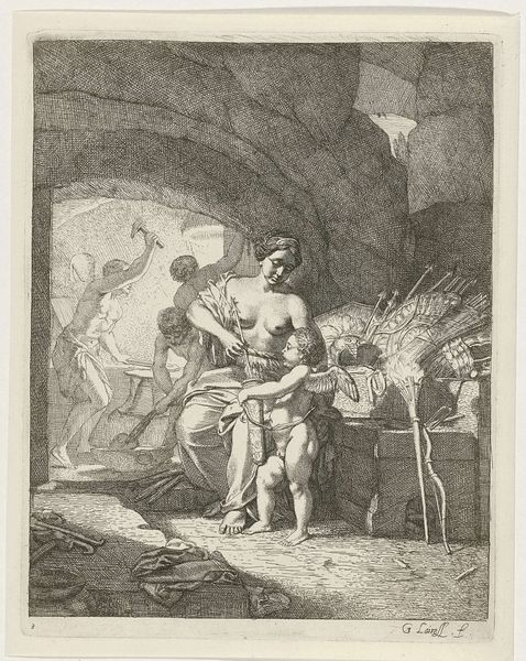 Curator: We’re looking at Ferdinand Bol’s “The Sacrifice of Abraham,” dating from roughly 1642 to 1651. It’s an etching, currently housed at The Art Institute of Chicago. Editor: The rendering is incredibly detailed. The whole composition feels claustrophobic, almost as if all the figures are trapped within this circular frame, further amplifying the tense moment depicted. What can you tell us about this piece? Curator: Well, beyond the immediately apparent Biblical narrative, I’m interested in the processes inherent to creating such a work. Consider the materiality of the etching itself. What does it mean to translate this dramatic scene, originally conceived perhaps on a grand scale, into this repeatable, and therefore more accessible, form? The lines and tonal shifts – how does that speak to access and circulation in 17th-century Europe? Editor: That's interesting – it is a reproduction after all. So, it’s not only the subject matter, but also the inherent social aspect of making and distributing this print that adds meaning? Curator: Precisely. And consider how labor enters this equation. Bol wasn’t merely illustrating scripture; he was participating in a print market. This etching wouldn't be for a single patron but was rather made as a consumer good that was sold and purchased, unlike a large scale painted alter piece, no? So how do such production processes effect how we interpret this work, would you say? Editor: That puts things into perspective! It goes beyond simply portraying a scene to becoming a commodity circulated within society. I hadn't considered the effect of the printmaking process itself until now. Thanks! Curator: The etching invites contemplation on how meaning is crafted not only by the artist but also by the tools and economic forces that facilitate its creation and circulation. It’s fascinating, isn’t it?