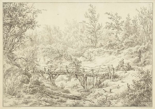 Curator: Here we have Ernst Willem Jan Bagelaar’s “Duinlandschap met wandelaar bij Bloemendaal," an etching, drawing, and print, placing its creation somewhere between 1798 and 1837. Editor: It's amazing how a seemingly simple landscape can evoke such a powerful sense of solitude and reflection. The muted tones and fine lines create this very contemplative mood. Curator: This etching exemplifies the period's fascination with the natural world. Think about how the Dutch Golden Age landscapes reflected a new sense of national identity. It's not just about visual representation, but an expression of cultural pride and ownership over their land. The landscapes tell us about Dutch maritime power, trade, and the general economic vitality. Editor: Yes, but it’s also important to remember how such images can be complicated. Who has access to this landscape? Whose story is not represented? Are we glorifying an idealised landscape which overlooks its environmental history, as well as those who rely on it for livelihood? The man is alone, yes, but what about the structures which make him the agent in that specific area? The way he traverses this scene? Curator: That's an interesting point, and it pushes us to consider landscape art as more than mere depiction. During Bagelaar’s life, the Netherlands went through enormous upheaval with the Batavian Republic and then French rule, for example. It may seem innocuous, but landscapes gained considerable patriotic value at this time. In creating images of specifically Dutch terrain, artists also reaffirmed, redefined, and indeed sometimes mythologized Dutch identity. Editor: I can certainly see that layer, especially knowing the broader political context of that time. It definitely invites a much richer understanding. Ultimately, this scene strikes me as simultaneously inviting, with its soft lines, yet slightly alienating due to the scale between the walker and the distant, and nearly faded, tower. The detail, achieved with such delicate materials, feels quite monumental. Curator: Indeed. By drawing attention to the details, one begins to consider more completely not only the aesthetic value but the history entangled within. Editor: Thanks. Considering that element makes all the difference in connecting and respecting these objects.