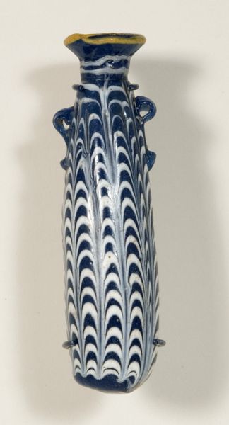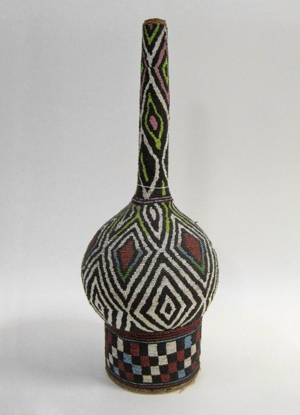 This beaded wine bottle with stopper was made by Grasslands. I love how the overall form is so traditional, but the surface is radical. The whole object is covered in tiny beads in tightly controlled patterns of zig-zags and spirals. What I notice most are the black and white spirals that wind around the body of the bottle, they almost seem to move, like the object is vibrating in front of your eyes. Up close, you can see the texture of the beads, how they catch the light, this is a labor intensive process that shows a dedication to the craft. Look at the way that the beads create the shapes, it’s quite playful. The way that this piece combines a historical form with a contemporary sensibility makes me think of the way Elizabeth Murray used to approach still life, but with beads. It's about how we keep the conversation going, across cultures, across time.