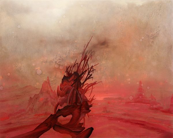 Joshua Flint’s ambiguous, contemporary painting, Lakeside, presents us with the enduring motif of figures in a landscape, a scene replete with collective memory. Here, beneath ghostly, bell-shaped flowers, we see figures lounging, almost weightless, against the imposing backdrop of a rugged mountain. The mountain looms large, an archetype rooted deep in our cultural psyche. In antiquity, mountains were sacred, the dwelling places of gods, symbols of stability and permanence. Think of Mount Olympus in Greek mythology, or Mount Sinai, where Moses received the Ten Commandments. Flint subtly subverts this symbolism. His mountain is shrouded in darkness, rendered with an unsettling instability. It evokes not serenity, but a sense of foreboding. This reflects a modern anxiety, a subconscious recognition of nature’s power, and humanity’s precarious place within it. The mountain persists, transformed by the relentless march of time, a silent witness to our ever-evolving anxieties and aspirations.