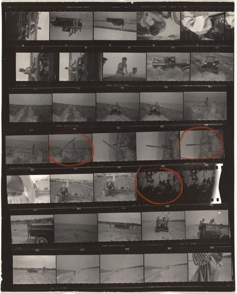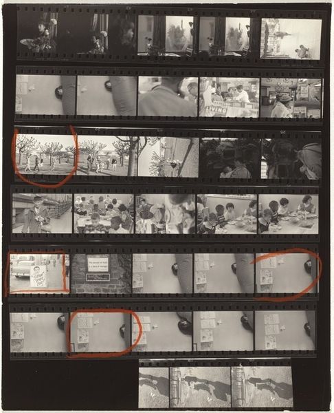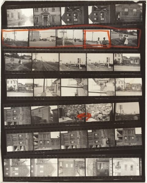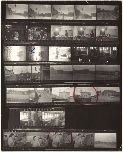Curator: Robert Frank’s photographic work, "Guggenheim 59/Americans 69--Detroit" from 1955, showcases a filmstrip brimming with captured moments, offering glimpses into American life of the time. The stark black and white palette, and the raw, unpolished feel… well, what does it spark in you? Editor: It’s like stumbling across a time capsule – a gritty, dreamlike echo of the past. I'm getting a real sense of…disquiet? The starkness and how one memory is stacked against another gives it a sense of barely controlled chaos. Curator: I think you've hit on something important there: disquiet. Frank, you see, aimed to disrupt the idealized image of America. Film as material and process—its layered moments speak volumes, right? The dark shadows, high contrast and blur almost hint at an emotional reality of those people, and this society as well. Editor: Precisely. These aren't glossy magazine snapshots. Each frame flickers like a memory—fragmented, imperfect and all the more powerful for it. I keep returning to a sequence near the center... It looks like someone repairing something? Each one of those small panels tell a whole story of it's own, or fragments thereof, at least. I'd never thought to explore them this way; laid out next to one another as this sort of proof sheet, each captured on film. Curator: Look how the format echoes the themes of the American project - snapshots strung together—suggests continuity yet underlines disparity. A dark colour palate dominates across most the frames, don't you think? Editor: Absolutely, that dark palate really sticks. As you are suggesting it definitely amplifies the underlying unease. Frank is brilliant; so full of complex reflection and interpretation, it seeps from the very film itself. This is much deeper than 'snapshots.' Curator: Indeed! It’s an artifact demanding we question the stories we tell ourselves. Editor: The truth is layered in shadows. This will certainly sit with me for awhile!