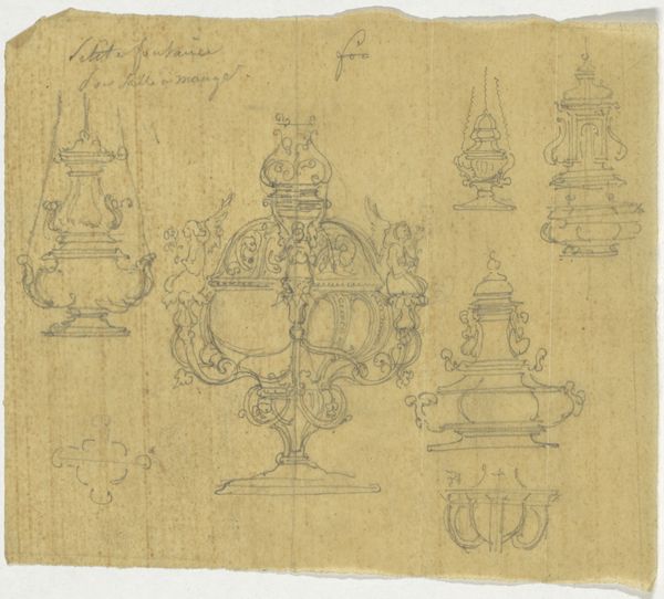 Curator: Let's turn our attention to this page of "Ontwerpen voor diverse bronzen voorwerpen," or Designs for Various Bronze Objects, attributed to Firma Feuchère, dating from around 1830 to 1850. What are your first impressions? Editor: It's a whisper of a drawing. The pencil work is so delicate, it feels like I'm looking at captured moonlight on aged paper. Sort of ghostly, almost hesitant, yet bursting with intricate detail. Curator: Indeed. We're seeing design sketches here, likely for presentation to a client, showcasing possible bronze objects – goblets, candlesticks, decorative mounts. The medium is pencil and possibly watercolor on toned paper. It shows their engagement in neoclassical styles. Editor: And you can almost smell the workshop dust, can’t you? Imagine the artisan's hands, calloused but precise, coaxing molten metal into these ornate forms. It's lovely, isn't it? All these designs laid out; a silent proposition and an entire ecosystem of skilled labor condensed onto one fragile page. Curator: Exactly. Each of these designs represented hours of labor, from the initial sketch to the finished bronze object. Feuchère's firm employed numerous highly skilled artisans. Considering the social context, it embodies a bridge between art and industry, showcasing how design translates into material production during this period. Editor: Absolutely. There's a raw, intimate energy in seeing this design work, like peering into the creative incubator that births the final gilded piece. And it is so cool and a tiny bit incomplete and imperfect. Much more intriguing than flawless perfection! Curator: A sentiment I share. It's like finding the secret language of creation. These are more than just sketches, aren't they? They are tangible traces of design translated into material realities. The circulation of design became easier in this period and it democratized art-making as it was spread among all classes, but not perfectly! Editor: No, never perfectly! And the incomplete nature gives each element such potency and charge to consider possibilities rather than fixed realities. It truly makes one think of all this artwork could have been. That's its power for me. Curator: An excellent observation, reminding us that material culture, even in its embryonic sketch form, carries within it untold stories. Editor: Yes, like echoes in the bronze—tales of hands, fire, and the alchemy of creation.