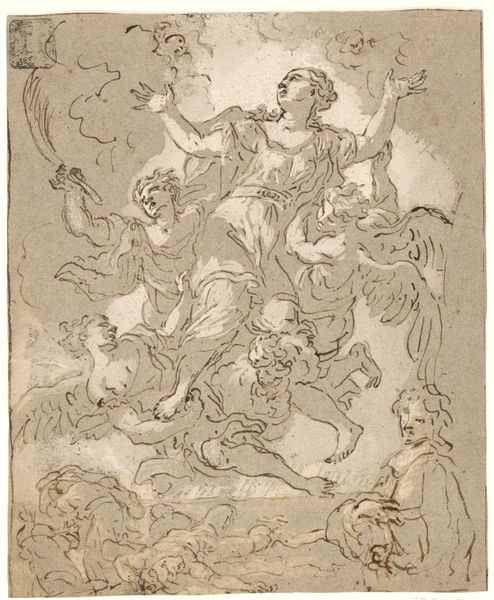 This drawing of the Madonna and Child with saints and souls is rendered in pen and brown ink on paper. The composition is divided into distinct zones, each employing line and form to convey a sense of spiritual hierarchy. The upper portion features ethereal figures sketched with delicate lines, creating a contrast with the more defined contours of the Madonna and Child. Below, the lost souls are depicted with expressive, gestural strokes, emphasizing their turmoil. The linear perspective draws your eye upward, reinforcing a visual ascension towards divine grace. What's particularly striking is the tension between the central religious scene and the ornamental border designs. This juxtaposition destabilizes the conventional sacred image, inviting a more profound contemplation on the interplay between the earthly and the divine. Through this formal structure, the drawing embodies a larger discourse on faith, salvation, and the very act of representation.
