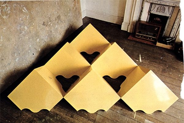 Editor: This is Michael Bolus's "4th Sculpture," created in 1966. It looks like an assemblage of modular, geometric shapes made of painted paper. It reminds me of Constructivism. What can you tell me about it? Curator: Well, consider the materials. We have paper, paint, modular construction... elements typically relegated to 'craft,' now elevated to the status of 'sculpture'. In the 60s, artists were actively questioning traditional art boundaries, pushing back against the idea of the unique, handmade art object. Editor: So, the use of these simple materials is intentional? It's a commentary on what gets considered art? Curator: Precisely. Think about the labour involved. It's repetitive, almost industrial in its simplicity. Is Bolus commenting on the shift towards mass production and consumerism of the era? Is the choice of using paper related to disposable goods? Editor: That's fascinating. I hadn't considered the connection to mass production. The 'modular' aspect seems important then. Curator: Absolutely. The repeated form allows for endless possibilities. One could buy kits and arrange the elements differently. It removes the artist's singular authority, democratizing the creative process, reflecting social change toward egalitarianism. Do you think the white and yellow colouration might have to do with industrial design conventions? Editor: I guess, yellow and white are non-offensive. Thinking of art making that questions tradition makes me wonder if it influenced other similar works from his time. Curator: Definitely. By understanding Bolus's work within this broader context, we see how he challenges the conventions of sculpture by foregrounding material, process, and production. Editor: This was incredibly insightful. I appreciate you pointing out the link between materials and societal shifts of the 1960s! Curator: My pleasure! It's all about tracing those material threads and their connection to the world around us.
