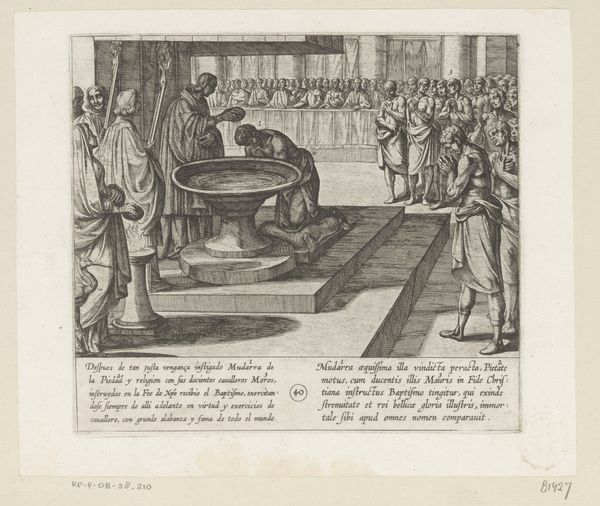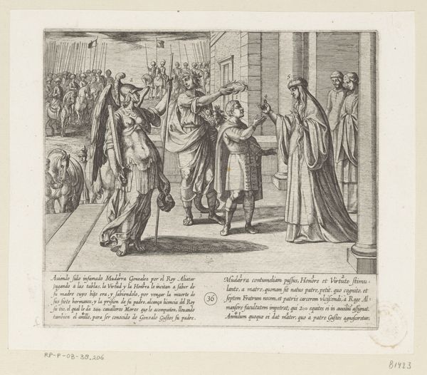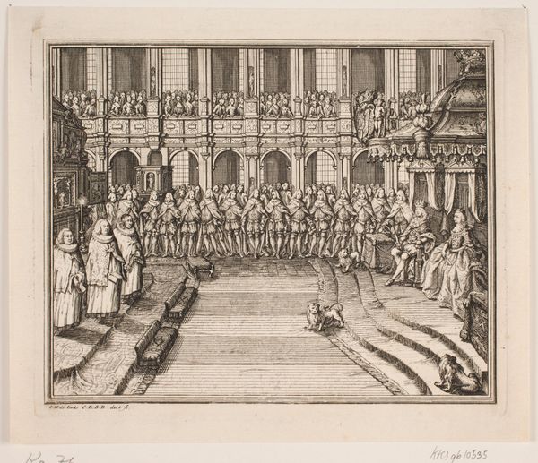 Editor: This is Antonio Tempesta's 1612 engraving, "Gonzalo Gustos herkent zijn zoon aan zijn ring," housed at the Rijksmuseum. The tight linework creates such a dramatic density, particularly in the background. It almost feels claustrophobic. How do you interpret this print? Curator: Indeed. Note how the artist meticulously employs hatching and cross-hatching. This precise method defines the forms, establishes light and shadow, and contributes to the overall compositional balance. The convergence of lines directs our gaze to the central figures, thereby constructing a focal point within this elaborate setting. Editor: So the artist is using line almost like a stage director uses lighting to focus our attention? Curator: Precisely. Furthermore, examine how the artist manipulates line weight to generate a sense of depth and dimension. This technical skill contributes to a coherent, albeit complex, visual experience. One might even suggest that Tempesta’s use of engraving serves to underscore the emotional intensity of the depicted scene. Do you notice any particular groupings of figures or any lines that seem to be of importance? Editor: I hadn't considered it that way before. Now I'm struck by the strong diagonal line created by the raised platform that draws my eye straight to the men embracing. Curator: Observe, too, the way the rigidity and angularity inherent in engraving itself emphasizes the solemn nature of the encounter. By analyzing the formal elements—line, composition, contrast—we gain insight into how the artist constructs and conveys the emotional content of the scene. Editor: It’s amazing how much the choice of medium and technique influences the reading of the artwork. I am beginning to grasp the importance of considering the "how" alongside the "what". Curator: Precisely. By emphasizing structure and internal relations we can access and communicate art's significance.