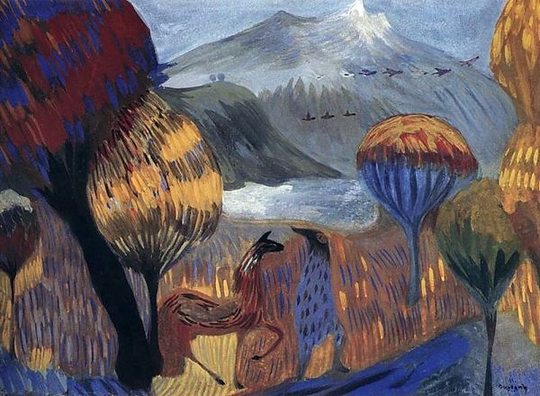 Martiros Sarian painted "Evening in the Mountains" using expressive brushstrokes of oil paint on canvas. The landscape isn't about exact representation, but more about capturing the essence of the scene. Sarian's technique is key here. Notice how he builds up layers of paint, creating a textured surface. The colors are vibrant, applied with a boldness that almost vibrates. He flattens the perspective, focusing on the interplay of shapes and colors rather than creating an illusion of depth. This draws attention to the materiality of the paint itself. In the early 20th century, artists were experimenting with abstraction, challenging traditional notions of what a painting should be. Sarian, while still referencing the natural world, pushes the boundaries by emphasizing the subjective experience and the physical properties of his medium. The result is a landscape transformed through the artist's unique vision and hand. It reminds us that art isn't just about seeing, it's about making.