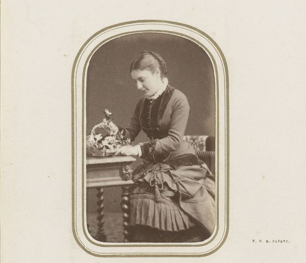Editor: So, here we have an anonymous gelatin-silver print from around 1892 to 1900, titled "Genrescène uit Faust, Gretchen aan een spinnewiel, naar Goethe"—depicting a scene from Goethe's Faust, with Gretchen at her spinning wheel. It feels so staged, so Victorian. What do you make of it? Curator: The photograph certainly evokes that late 19th-century fascination with Romantic themes. Considering the source material, Goethe’s Faust, what power dynamics are immediately apparent when viewing this image? What are we meant to understand about Gretchen's position through this carefully constructed scene? Editor: Well, she’s at her spinning wheel, which makes me think about domesticity and perhaps even being trapped by societal expectations of women. The subdued tones also add a layer of melancholy. Curator: Precisely. The spinning wheel becomes a powerful symbol here. Is it merely a tool for domestic labor, or does it also represent Gretchen’s confinement within a patriarchal structure, her isolation, and her eventual tragic fate in Faust? This was a time when women’s roles were heavily scrutinized. This image is both a portrait of feminine virtue and potential victimhood, deeply entrenched in the socio-political context of the era. How might a contemporary feminist lens interpret Gretchen’s posture and the overall composition? Editor: It’s interesting to consider how the staged nature of the photograph adds another layer. It’s not just a simple depiction; it’s a carefully crafted statement, reflecting and perhaps reinforcing existing social norms. I didn't immediately think of the feminist lens. Curator: Indeed. Examining this work through an intersectional lens helps us see the intricate connections between art, literature, and the social and political landscape of the time, urging us to critically examine power, representation, and the ongoing narratives surrounding identity and gender. Editor: This has definitely given me a new perspective to consider—seeing art not just as aesthetic beauty, but also as a reflection of societal structures and power dynamics.