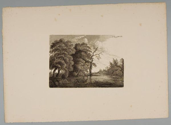 Editor: This is Henri-Joseph Harpignies' "Landscape with Two Hunters and Dog." It's a pastoral scene, rendered in soft, muted tones. What cultural echoes do you hear when you look at it? Curator: It reminds me how landscapes have long served as mirrors of our relationship with nature. Consider the hunters – are they merely figures in a scene, or do they represent a specific cultural attitude toward the wild? Perhaps a sense of dominion, or maybe a more symbiotic relationship? Editor: I hadn't considered the symbolic weight of hunting itself. Curator: Exactly! And the dog? Is it a loyal companion, a symbol of domestication, or something else entirely? These small details can reveal so much about the values of the time. What's your impression now? Editor: I’ll definitely see landscapes differently from now on! Thanks! Curator: Me too!