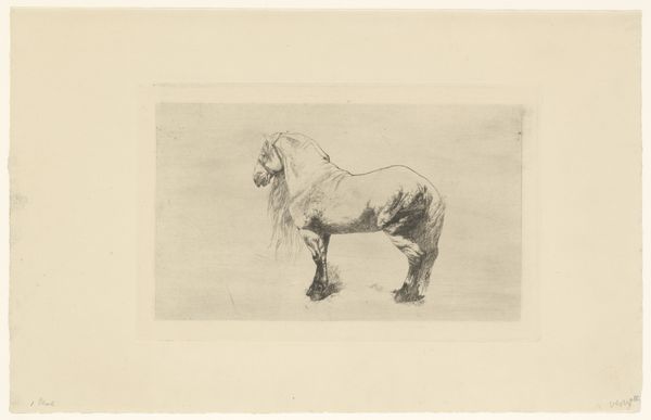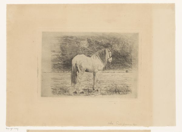 Editor: Here we have Paul Parmentier’s "Paard," which translates to "Horse," created between 1864 and 1902. It’s an etching, a print, and it strikes me as very simple, almost humble in its depiction. What draws your attention when you look at this work? Curator: For me, it’s the materiality of the printmaking process itself that resonates. Look at the cross-hatching and the evident labor involved in creating this image through etching. Think about the acid biting into the metal plate, the repeated process of applying ink, wiping it away, and pressing it onto paper. What does that say about how images were made and consumed during this period? Editor: That’s interesting. I was focused more on the subject, the horse in a landscape. But you’re saying we should consider the *how* as much as the *what*? Curator: Precisely. Consider the social context: Who had access to this technology? Who could afford prints? This piece offers a glimpse into the means of production and the social circulation of images, blurring the lines between fine art and the work involved in creating it. This isn't just about the horse, it's about labor. Editor: I never considered how much labor went into creating this seemingly simple etching. Seeing it as a product of both artistic skill and material processes really changes my perspective. Thanks! Curator: My pleasure. It is crucial to go beyond what is visible to think about what went into creating the artwork, as well as what came after its creation: Who saw it? How did they value it? The print is not just an object but also a material historical trace.