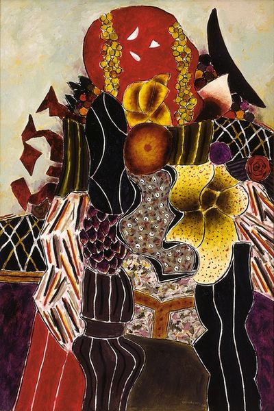 Curator: What a fascinating piece. We are looking at “Gardens III,” an acrylic on canvas created in 1992 by Ion Alin Gheorghiu. Editor: My immediate impression is organized chaos. It feels both intentional and impulsive, with clashing patterns vying for attention. There's a visual rhythm but not a clear harmony. Curator: Gheorghiu was deeply engaged with the sociopolitical shifts happening in Romania post-communism. His works often served as critiques of propaganda and state control through abstract means. Editor: You can certainly see that sense of deconstruction. Look at how the canvas is divided into zones, each with distinct graphic languages. Notice the almost childlike figures and symbols scattered across a central section. They lack any consistent perspective. Curator: That’s right, and note also the hints of folk art and the vibrant color palette. Gheorghiu was very conscious of art's role in reflecting social realities but avoided direct representation. This work uses coded imagery to engage with themes of identity and freedom. Editor: Interesting, because without that context, I read it primarily in terms of its composition. The thick outlines create a flattened effect, typical of naive art perhaps, but then those swirling lines in the bottom left introduce a spatial ambiguity. Is it receding? Or pushing forward? Curator: It's a space he constructs from visual fragments—a fractured narrative mirroring the social landscape of the time. The "garden" motif, likely alludes to themes of growth and resilience amid turbulence. Consider also the rise of Pattern and Decoration movement. Editor: True. Now that you point that out, the overall arrangement does feel somewhat decorative, even celebratory. Perhaps a joyful reclamation of personal space amidst upheaval? Despite all that tension, the painting as a whole retains a playful vitality. Curator: I think it reveals the ability of art to act as social commentary while simultaneously creating aesthetic experiences. Thank you, these observations about compositional elements certainly deepened my understanding. Editor: Absolutely! The interplay between those two dimensions – social history and formal qualities is exactly what makes it so compelling.
