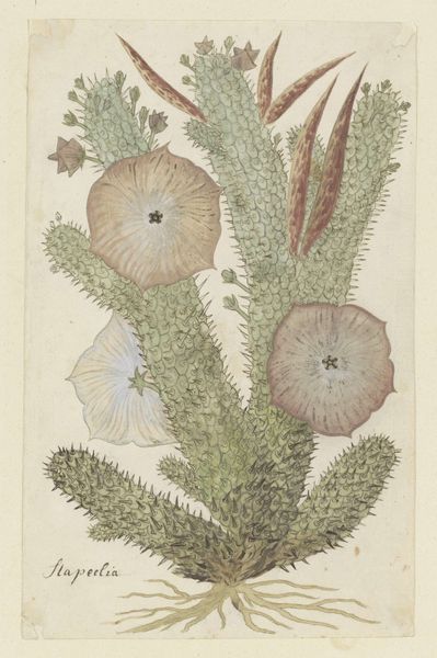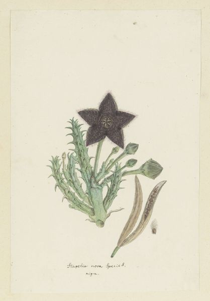 Curator: Up next we have a delicate watercolour illustration by Robert Jacob Gordon. It's titled "Tridentea pedunculata (Masson) L.C. Leach (Stapelia)," and thought to have been produced between 1777 and 1786. Editor: I’m immediately struck by its… stillness. The composition, so precisely rendered, almost feels like a scientific specimen pinned to a board. A botanist's meticulous record. Curator: Indeed, the artwork adheres to the naturalist style prevalent during the Enlightenment. Gordon's use of watercolor on paper allows for a delicate depiction of the plant's form. Note how the botanical structures are detailed precisely, as if for identification purposes. Editor: Yes, observe the arrangement; how the composition guides your eye from the radiating roots, upwards to the cluster of leaves and the star-shaped flowers above. There's a pleasing visual rhythm here. Curator: This brings us to the cultural and historical context. Gordon, as a military officer and explorer for the Dutch East India Company, contributed to natural history by documenting his botanical finds. Images like these aided scientific understanding within colonial enterprises. Editor: But did it extend beyond that? Surely these naturalistic studies fulfilled aesthetic roles, too? How does Gordon’s technique, his very careful depiction of light and shade, emphasize an emotional or affective connection between viewer and nature? It has presence. Curator: I appreciate the perspective of someone so keenly attentive to aesthetics. The soft coloring, a testament to watercolor’s particular qualities, softens what might be considered a clinical approach. Editor: Precisely, the watercolor almost breathes life back into the otherwise very controlled, ordered drawing. Curator: These tensions highlight the complexities of art made during this time. A blend of science, exploration, colonialism and an evolving sensibility to the aesthetics of the natural world. Editor: I will certainly look differently at similar art after taking on these notions of precision, life, colonialism and botanical science. Thank you for this instructive discussion.