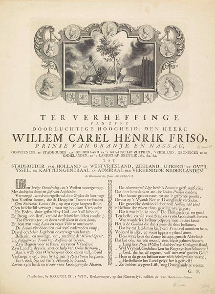 This anonymous New Year’s print from 1795, created through engraving, presents a fascinating snapshot of its time. The composition is divided, with an ornate cartouche at the top and densely packed text below, creating a visual dialogue between image and word. The cartouche is particularly striking. It features a man holding what appears to be a rattle. This is framed by symbolic figures: a lion, a tree, and crests, each carefully rendered to convey power and prosperity. The symmetrical arrangement and detailed execution evoke a sense of balance and order. Yet, the overall effect is not one of straightforward celebration. Consider how the print uses visual language to express complex political ideas. The formal choices—the arrangement of elements, the contrast between image and text—invite us to decode its message. The print functions as both a commemorative object and a commentary on the shifting socio-political landscape. The visual elements and their arrangement reflect broader cultural codes and beliefs about governance and societal order.