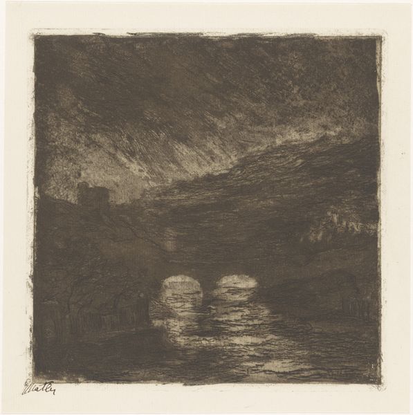 Curator: This etching by David Lucas, titled "Hampstead Heath", dates back to 1829 and is currently housed at the Metropolitan Museum of Art. What strikes you most about it? Editor: Its brooding intensity. The swirling clouds and windswept landscape seem almost alive. It feels raw and untamed, unlike the manicured landscapes often associated with the English elite. Curator: I agree. Lucas was working from sketches by John Constable, who deeply valued capturing the effects of nature's constant change. Considering this piece is a print, what do you observe about Lucas's handling of the medium? Editor: The intricacy is astonishing. Note the varied line work—some areas densely packed, creating deep shadows, and others light and airy. You can practically feel the wind whipping through the grasses. It’s a remarkable example of how printmaking can become an art of atmospheric and social commentary, pushing against more polished forms of painting. Curator: Absolutely. The etching process, using acid to bite into the metal plate, allows for a range of tonal values achieved by manipulating the application of stopping-out varnish. Think of the labor invested in realizing such subtle gradations across the entire plate. The final print, reproduced and distributed, brings this experience to a wider audience. It creates accessibility. Editor: That's a good point about accessibility. But in the context of early 19th-century England, I'm curious about who actually consumed prints like these. Were they affordable enough for the working classes, offering a vision of the land beyond the factories, or mainly for the bourgeois appreciating their version of nature? Curator: The pricing would have been a key factor in its accessibility, tied directly to Lucas’s workshop’s operational costs. Also, keep in mind the role of the Royal Academy, exhibition culture, and networks of patronage in legitimizing landscape as a critical form of art. This artwork becomes part of a wider dialogue surrounding taste and artistic production. Editor: Fascinating. "Hampstead Heath" provides much more than a scene. It delivers social and cultural data regarding production, distribution, and consumption to a broad audience of its time. Curator: Indeed. The landscape is never a neutral zone; instead, we find complex systems that tie production and making, consumption and society.