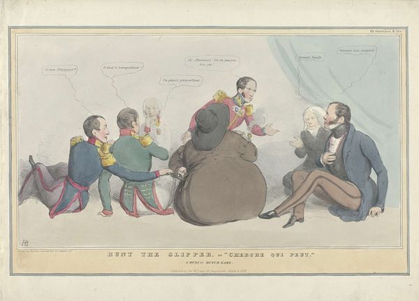 George Hunt made this hand-colored etching, entitled "A Real Rubber! At Whist," in England in the early 19th century. The scene depicts a game of whist, a popular card game among the upper classes, and the exaggerated features of the players suggest a satirical commentary on the social rituals and pretensions of the time. We can see some of the cultural codes of the era, such as elaborate wigs and dresses, aristocratic detachment, and the ever-present male servant. The visual codes used by Hunt create meaning here through caricature, which was a popular form of social critique in Georgian England, often used to comment on class, manners, and morality. Hunt's work reflects the broader context of a society grappling with rapid social and economic changes, as traditional hierarchies were being challenged by new forms of wealth and social mobility. As a social historian, looking at prints like this, I would want to know more about the institutions, like print shops and subscription services, that shaped how art was produced, circulated, and consumed.