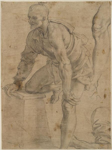 Curator: Hendrik Martensz. Sorgh's drawing, "A Peasant Broiling Meat," now residing in the Harvard Art Museums, presents a modest domestic scene. Editor: It strikes me as both intimate and a bit melancholic, almost as if glimpsed through a hazy memory. The monochromatic palette certainly contributes to this feeling. Curator: Observe how Sorgh masterfully uses line and shadow to define form. The composition, while seemingly simple, reveals a keen understanding of spatial relationships. Editor: The cat is interesting, isn't it? Cats often symbolize domesticity, but also cunning and independence. Its gaze, directed toward the meat, suggests desire and perhaps a hint of mischief. Curator: Indeed, and consider the placement of the peasant, almost central, yet subtly off-kilter. This creates a dynamic tension, preventing the scene from becoming static. Editor: The man’s gaze also seems rather knowing. Perhaps he’s aware of the little drama unfolding between the cat and its potential meal? It suggests a story, even though simple. Curator: A narrative distilled to its essence, relying on the viewer's interpretation to fill in the gaps. Editor: It is a delightful invitation to contemplate the everyday symbolism embedded within what seems like a humble genre scene.