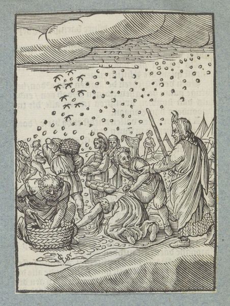 Editor: Here we have a work by Christoffel van Sichem II from around 1645, titled "Gods verbond met Abraham; Jakob zalft de steen waarop hij geslapen heeft" – a drawing rendered in ink using engraving. It's striking how much detail is packed into such a small space. I'm curious, what catches your eye when you look at this? Curator: I’m immediately drawn to how this engraving reflects the prevailing social and religious narratives of the time. Consider the emphasis on covenants, divine promises – ideas deeply ingrained in 17th-century society. Who do you think the figures are meant to be? And what kind of statements do you think they were trying to communicate to the contemporary viewers of the work? Editor: Well, judging from the title, one figure must be Abraham entering a covenant with God, while the other seems to be Jacob anointing the stone. The act of anointing suggests a ritual of consecration, establishing the stone as a sacred site, doesn't it? It looks almost like propaganda! Curator: Precisely! Religious art served a critical function, especially amidst the Reformation and Counter-Reformation. Engravings like this would have been widely distributed, visually reinforcing religious teachings and moral values within the domestic sphere, in schools, and even political spaces. This makes you think, doesn't it, about how art was so intertwined with political and ideological currents of the era. The piece uses biblical narratives to subtly reinforce a certain worldview. Do you think a piece such as this could be interpreted differently if viewed by someone from a different faith background or historical period? Editor: That’s a great point! Someone from another background might see the anointing as simply anointing a rock! They may see other images like that of god above and criticize them, due to differing social expectations. Curator: Exactly, these details allow us a nuanced understanding of how cultural forces shape both the production and interpretation of art. The politics of imagery, if you will! Editor: I hadn't considered it that way. I now see how deeply rooted this artwork is in its socio-political environment. Curator: And that, in turn, allows us to appreciate the complexities of its meaning and impact on its original audience.