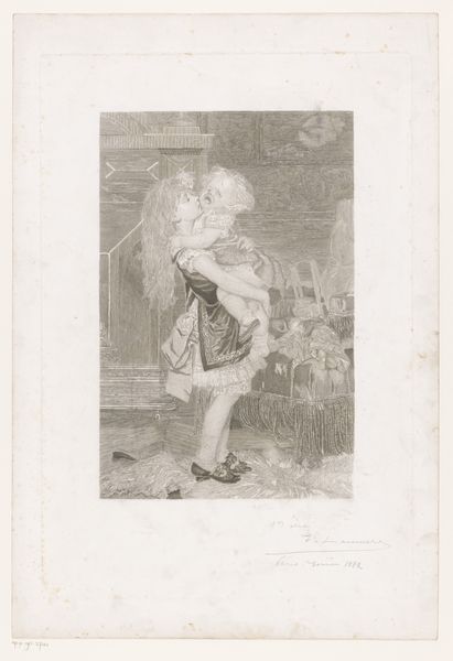 Auguste Danse made this etching, “Meisje inspecteert de kras, die de kat haar op de arm gaf”, which translates to “Girl inspects the scratch that the cat gave her on the arm”, using traditional printmaking materials, processes, and tools. The fine lines of the etching and the monochromatic palette create a delicate and intimate atmosphere. The girl, rendered in meticulous detail, stands in what looks to be a tiled hallway, next to a cat. The process of etching involves coating a metal plate with a waxy, acid-resistant ground, scratching an image into the ground, and then immersing the plate in acid. The acid bites into the exposed metal, creating recessed lines that hold ink. The plate is then wiped clean, leaving ink only in the etched lines. Finally, damp paper is pressed against the plate, transferring the ink to the paper. The work that goes into the etching process can be related to the labor of the girl’s upbringing, in contrast to the leisure activity of keeping a pet. Understanding the materials, making, and context of the artwork allows us to appreciate the skill involved in its production.