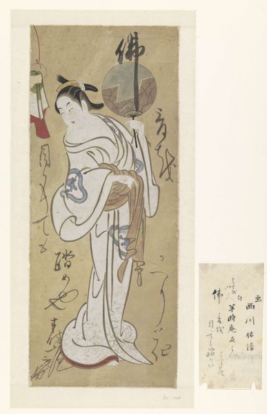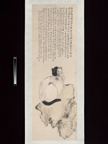 Curator: Let's discuss this fascinating "Portrait of Buddha," of unknown date, attributed to Wang Zhen, a striking hanging scroll presented in ink and color on silk. The artwork resides here at the Minneapolis Institute of Art. I'm curious about your first impression. Editor: Well, immediately, I’m drawn to the tangible contrast. Look at how the artist renders the figure: soft, almost smudged application of the reddish color, especially in the robe, but surrounding it are crisp lines of dynamic calligraphic text and minimal definition of the support it sits upon. The production involved a real mastery of different techniques with simple means. Curator: It's essential to acknowledge the context of portraits in Buddhist traditions. Representation often blurs the line between mortal figures and transcendent ideals. Wang Zhen uses the art to participate and promote conversations about spiritual authority, using figuration as an expression of those complex ideological concepts. How does that interplay with materiality here? Editor: The choice of silk, in conjunction with the ink, implies an effort to fuse craft and devotional practice. Also, considering the labor required to grind ink, prepare the silk, the embodied work comes across in viewing this object; It serves not only to transmit image but values regarding mindful activity. Curator: Exactly! The text woven within—its very placement and prominence—demands an exploration of language and symbolism, as social actions. Who might have commissioned a piece like this, and how would the artwork participate in cultural or religious events during the artist’s life? Editor: The state of the color pigments—their fragility—reminds me that the work now stands divorced from those original environments of ritual consumption. The pigments suggest impermanence. It speaks to broader commentary about consumerism and materiality through the lens of loss. Curator: Thank you, this has really widened my view of the cultural values present in Wang Zhen’s “Portrait of Buddha,” prompting conversations about access, labor and the life cycles of meaning embedded within art production. Editor: I agree. Understanding how the choice of material, the work process and historical use is integral to understanding the portrait.
