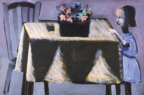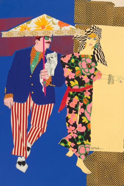 Curator: Well, look at this striking mixed-media artwork titled "Symbols Study #2" by Benny Andrews, created back in 1970. What's your initial gut reaction? Editor: It feels unsettlingly…theatrical? Like figures on a very crowded stage, almost cartoonish, yet there’s something genuinely disturbing about that wide grin. Curator: Yes! The smile does seem intentionally unsettling, even sinister against the backdrop of those oddly juxtaposed symbols. Speaking of, to me the safe, the roses, the vacant figure with the book--it reads like a checklist of classic symbols subverted somehow. Editor: Absolutely. Roses signify love, a safe represents security... But Andrews places them in a context that challenges those straightforward interpretations. The female figure is unreadable; is she complicit or oblivious? The blank expression... Curator: Right, is she reading an inventory of goods being kept in the safe, the man smirking knowing more than she? His stance atop the safe, which itself is sitting on wheels, evokes a false sense of security and an economic bubble waiting to burst. It feels intensely political, even predictive given when Andrews made it. It gives the feeling of an out of tune carnival ride. Editor: And that rug! All of that geometric abstraction, like so much noise beneath their feet...it might suggest cultural dislocation, the loss of traditional moorings. All this considered within a painting that features elements of collage… there’s a fracturing here. He's collaging symbols themselves. Curator: The mix of oil and acrylic with the pasted elements reinforces that. A disruption of expected materials adds another layer to this complex tableau. Did you say that Andrews creates theater within the viewer with such simple shapes and composition! The symbolism pulls us towards so many conflicting feelings... Editor: Exactly. I see layers and fragments: cultural anxieties expressed through archetypal forms… I appreciate its power of the social critique hidden beneath familiar images that leave more questions than answers Curator: I couldn’t agree more, there’s more questions here than any clear answers and its up to us to figure it out and perhaps question what images we associate to ideals ourselves! It really asks the viewer for introspection.
