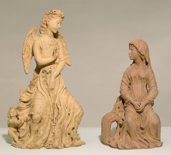 Editor: This terracotta sculpture from 1867 by Georg Christian Freund, titled "Pharaoh's Daughter Finds the Baby Moses," feels surprisingly intimate despite its grand subject. What do you see in this piece? Curator: Immediately, I'm drawn to the timeless symbols at play: a powerful female figure encountering innocence and vulnerability. It speaks to themes of compassion, adoption, and divine intervention. Can you see how the composition, the pyramid-like structure of the figures, emphasizes a hierarchy but also protection? The story itself carries enormous cultural weight, repeated in art, literature, and music for centuries. It asks the questions: who do we help, and why? Editor: I hadn't considered the pyramid shape consciously, but now that you mention it, the Pharaoh's daughter almost seems to be sheltering the infant Moses. Do you see a specific cultural or artistic tradition Freund is referencing through these symbols? Curator: Absolutely. Think of Renaissance depictions of the Madonna and Child. While the subject is different, Freund employs a similar visual language: serenity, idealized beauty, and an emphasis on the sacred nature of motherhood – themes that deeply resonated throughout the Victorian era. The image reflects cultural continuity. The Egyptians had a cult for the infant god Horus saved from the reeds by his mother Isis. Does the positioning of figures – their gestures, for example – evoke certain emotions? Editor: I think the way the handmaid gestures, as if presenting Moses, elicits a protective feeling towards the baby. Curator: Exactly! It underscores a vital moment of transition and destiny, shaped by empathy and defiance. I learned from your initial reading too: thinking of this sculpture's intimacy humanizes this significant scene, giving it new dimensions. Editor: It’s fascinating to see how so much can be conveyed through form and symbolism!