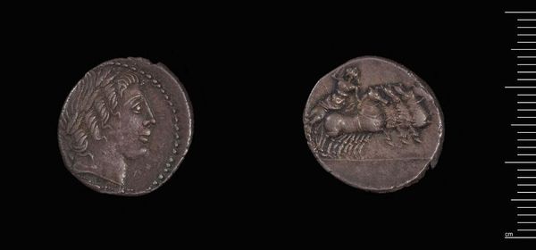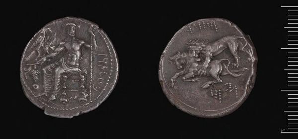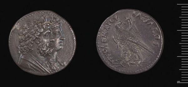 Curator: Here we have a Tetradrachm of Ptolemy II, struck in Tyre, a portrait of power rendered in miniature. Editor: There's something haunting about it, almost like a silver ghost whispering stories of ancient empires and forgotten ambitions. Curator: The coin presents a profile of Ptolemy II Philadelphos, his features captured with impressive detail, framed by stylized curls. Turn it over, and you'll see an eagle, a symbol of royal authority. Editor: I'm drawn to the wear and tear, the way the metal has aged. Those imperfections whisper secrets and offer a glimpse into the hands it must have passed through. Curator: Consider how this object was not merely currency, but propaganda, a carefully crafted image designed to project Ptolemaic power and legitimacy. Editor: Absolutely. It makes you think about how we immortalize ourselves. Is this coin really all that different from my Instagram? Curator: A fascinating comparison. I believe it brings an immediacy and humanity to history. Editor: It's like holding a piece of a dream, a tangible echo of a life lived millennia ago.