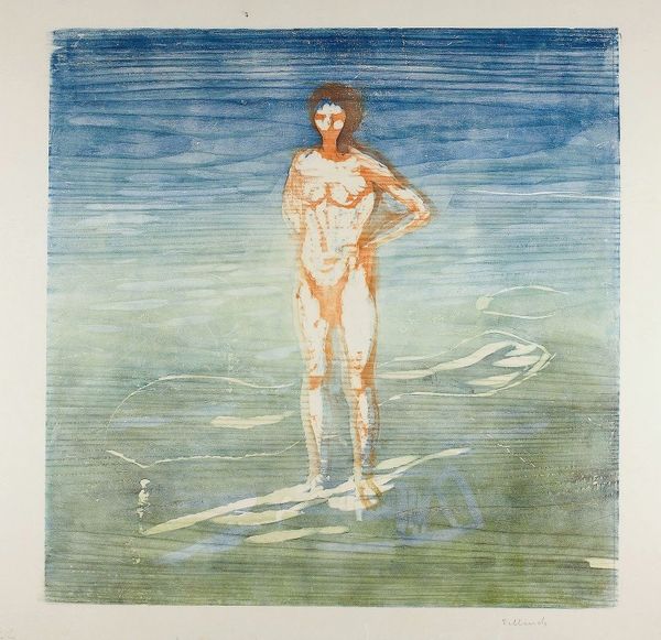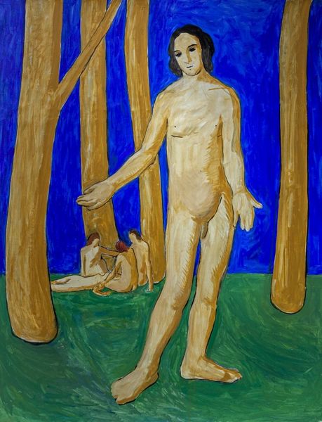 Koloman Moser made this "Standing Youth" using paint to give us a glimpse into his world. Look at how Moser approaches color, it's not about making the figure appear lifelike; instead, it's about building this figure through the act of painting. The yellow ochre tone of the youth's skin creates an interesting contrast with the blue-gray forms on either side of the figure, whatever they are—rocks, drapes, or clouds. Are those pillars? The texture of the paint is also really important here. It's not super thick, but you can see the brushstrokes, especially in the background, which creates a kind of shimmering effect. It makes you think about how the painting was made, layer by layer, decision by decision. There's a flatness to the body, too, as if it’s part of the picture plane itself. In some ways, it recalls the work of someone like Edvard Munch, in the way the figure is flattened and slightly distorted.