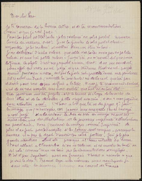 Editor: This is "Brief aan Héloïse Bernard-Bodin," a drawing made with pen on paper, sometime between 1878 and 1941, by Emile Bernard. It feels very personal and immediate, like we're reading someone's private thoughts. How would you interpret this work? Curator: It's tempting to view this solely as a window into Bernard’s mind, but let’s consider its materiality and its function within the broader artistic landscape. The pen and paper – these are readily available, democratic tools. Why would Bernard choose this medium over, say, oil paints for this particular piece of correspondence? Editor: Perhaps it was about speed and practicality? Easier to jot down thoughts than setting up an easel. Curator: Precisely. But what does that immediacy and ease suggest about Bernard's relationship to his work and the market? It is literally a letter. Could we examine how he is relating artistic labor and his own production with ideas of commerce and social capital? Editor: So, it's less about the artistic content and more about how it reflects his means of making and his potential economic considerations? Curator: Exactly. Think about the paper itself - its texture, its potential for mass production. How does this humble material connect to broader questions about accessibility and the democratisation of art? Editor: That’s fascinating! I hadn't considered how the choice of materials and form factors into how we understand the economics of his creative choices. Curator: By understanding the materials, we can also then trace back into that social-economic construct and ask questions about its origin, the suppliers, the distribution lines, and finally what all that mean to the final viewer who engages with the work. Editor: I now appreciate that there’s a dialogue happening here - between the artist, the materials, and the larger context. Thank you.