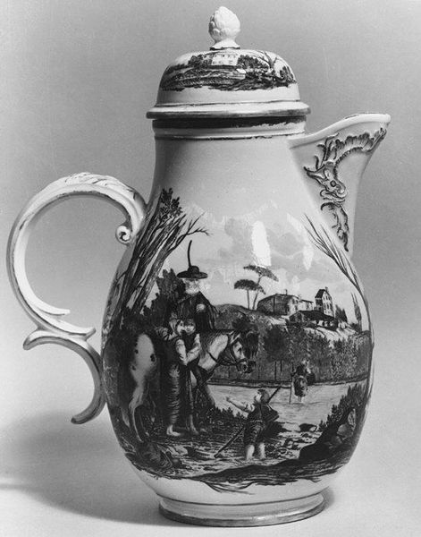 Editor: Here we have a porcelain jug, dating back to between 1730 and 1745, made at the Meissen Manufactory. It's charming, in a slightly odd way. All these tiny figures painted around the base give it a narrative feel... like a little stage. What's your take? Curator: It is, isn't it? A perfectly formed theatre of the everyday! To me, it’s pure Rococo delight— that love of playful asymmetry and elaborate detail. Can you see the genre scenes painted on the surface, hinting at fashionable life from the time? Editor: The figures are a bit peculiar though, aren’t they? Some have almost… caricatured features? Curator: Indeed. Meissen, in its quest to emulate Chinese porcelain, often interpreted Eastern aesthetics through a Western lens. It's an intriguing dance of cultures and perceptions. But look at how the handle curves, ending in that delicate flourish, and those tiny birds fluttering about! Don’t you think there’s a musical quality to the whole design? Editor: I hadn't thought of it like that! It's as if the jug itself is humming a little tune. Is that a common thread in decorative art from this era, that playful elegance? Curator: Absolutely! Rococo was all about celebrating joy, beauty, and refined taste. This jug, in its own quiet way, becomes a little ambassador of that spirit, a tangible embodiment of its time. It asks us, even now, to consider that balance, doesn't it? Editor: It’s amazing how an object intended for practical use can reveal so much about the culture that produced it. Curator: And how that culture can still speak to us, centuries later, if we're willing to listen to its whispers. A cup of tea will never be the same again.