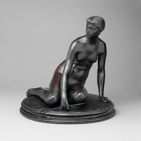 Curator: What strikes you first about this piece, knowing that it's John Quincy Adams Ward's bronze sculpture, "The Freedman," created around 1862-1863? Editor: Honestly? Melancholy. It’s there in the slope of his shoulders, the downward gaze. Despite being freed from literal chains, there's a profound sense of… what? Burden? Weariness? The sculpture invites me into a quiet space of reflection, and maybe even shared grief. Curator: Grief, perhaps, yes, but also resilience. Ward chose to depict the figure seated on what appears to be a tree stump, and notably, the broken shackles are still attached to his wrist, although they've been forced open. Consider the visual symbolism here; we're presented with realism that transcends literal representation. The texture and anatomical detail call back classical ideals even while charting a brand new narrative for American sculpture. Editor: Ah, that seated pose. I was thinking how it mirrors those classical depictions of seated philosophers. So is Ward placing this man—a formerly enslaved person—within that lineage of thinkers, of intellectual figures? But yes, you are so right. Note the positioning and rendering of the broken chains still hanging from his left wrist; there's liberation mixed with painful recent past, which evokes both an end, and new beginnings, right? And consider his gaze—he is both looking at the broken shackle, and away into the unknown. Curator: Exactly! Ward is playing with so much. This was created during the Civil War, and displayed at a time of immense social and political upheaval. It serves as both a historical record and a powerful commentary. But it also avoids sentimentality; Ward grounds it in the reality of the figure's lived experience, and the work challenges viewers to grapple with the complexities of freedom. I wonder, for what end do you think Ward sculpted this, as an American and witness of the realities that it invokes? Editor: I think Ward, was attempting a new American sculpture, a new realism steeped in complex emotional narrative that forces confrontation. Perhaps he envisioned this piece as more than a commentary on freedom. It seems to call out a past that continues into the present, both inviting, and confronting. What do you take away as the lasting impression of this sculpture? Curator: It’s Ward's sensitive portrayal that stays with me—the tension between physical strength and the deep introspection reflected in his posture and averted eyes. It's a powerful testament to the human spirit navigating the path from bondage towards an uncertain future, one wrought with challenges still present today.
