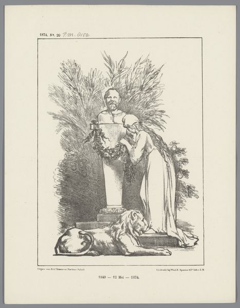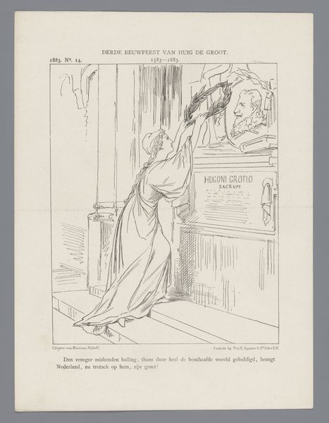 Editor: Here we have "Spotprent over de suikernood, 1884" by Johan Michaël Schmidt Crans, rendered in ink. It looks to me like a commentary on something – it definitely has a storytelling quality, and some of the figures are drawn in a caricatured style. What can you tell me about the composition? Curator: This drawing is compelling from a Formalist perspective. Note how the artist uses line to define space and form, but it also seems like the artist has an opinion here; for example, the dark shading used on one character juxtaposes against the fine, clean linework of another. Do you see how this technique isolates the forms? Editor: I do, and it really seems to draw a contrast between the two! Why did the artist choose these particular forms? Curator: Precisely. Consider also the internal structure. The central figures create a pyramidal shape, drawing the viewer's eye upward. But then your eye returns down, almost trapped in this… tableau. What does the repetition of that line quality across these characters suggest to you? Editor: I wonder if that draws a sort of relationship between the three people depicted here...it looks like one is fainting or unwell, while one looms over and another hovers to the side. I’d never have thought about that. I was so focused on trying to guess at some kind of outside context! Curator: Formal analysis allows us to focus on the elements that the artist uses to imbue a piece with a particular quality. And sometimes it can point to what kind of content is being created. Now, would you say you see an order imposed here? Editor: I see it now! I am struck by the way pure visual analysis of this piece revealed so much. Curator: Agreed. It is a good method of accessing underlying ideas and themes that you can use time and again.
