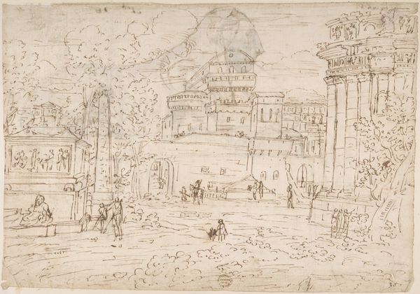Editor: This is “Figures Watching a Display of Fireworks at Castel Sant'Angelo, Rome” by Giovanni Francesco Grimaldi, made sometime between 1606 and 1680, using ink in a drawing. The fireworks make me think about celebrations, but the thin ink lines give it a somewhat unfinished quality, as though the revelry is fleeting. What stands out to you? Curator: Well, look closely at the means of production: ink on paper. How was paper produced then? Who had access to it? This drawing captures a leisure scene, but it’s important to consider who could afford the *time* for leisure, to watch fireworks, and who commissioned or consumed art like this. Is it recording reality, or shaping a desired narrative of power? Editor: I hadn’t thought about the paper itself. So, by considering who had access to paper, you’re saying that it becomes about the socio-economic structure of the time? It wasn't just some random sketch but tells the tale of a society? Curator: Exactly. Fireworks, like this drawing, are a product. Labor and materials are involved in both the spectacle and its artistic representation. Think about the consumption – of entertainment, of art – and who benefits. Consider the contrast: the grand display versus the relative austerity of the ink drawing as a commodity for a patron. Does Grimaldi elevate or subtly critique that relationship? Editor: So you’re suggesting the drawing’s “simplicity” perhaps highlights the fleeting nature of the spectacle itself, underscoring the labour involved in creating moments of elite enjoyment? That hadn’t occurred to me. Curator: Precisely! Art is never created in a vacuum. Exploring the materials and means of production opens a pathway to understanding its cultural context and purpose within society. Editor: I see now how closely analyzing materials allows you to interpret beyond the surface representation of the scene. Thanks, this was very insightful! Curator: Indeed, looking at art through the lens of materials and production always reveals a richer understanding of the world it inhabits.