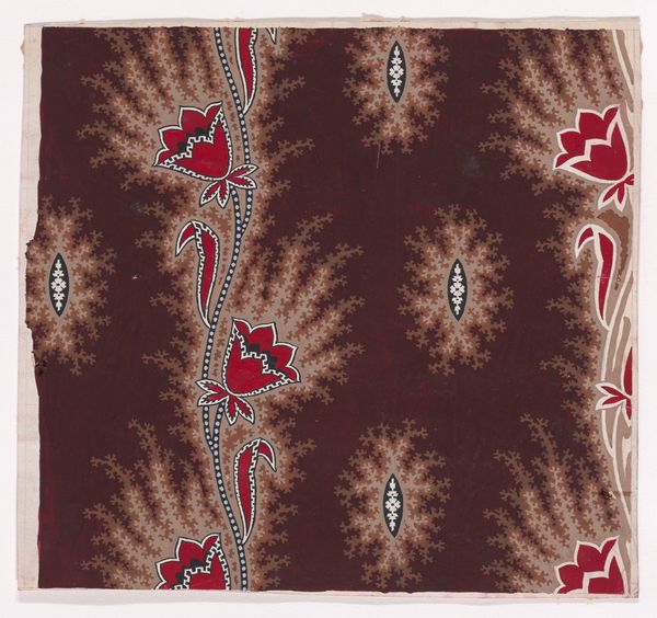 This textile design, made by an anonymous artist, probably involved watercolor or gouache on paper. The image shows vertical rows of stylized flowers framed by thorns, separated by garlands of branches, ribbons, pearls, and small flowers inside a circular frame. The design hints at the intersection of craft and commerce, where individual artistry meets the demands of larger production. It reflects the period's increasing industrialization, where textiles were mass-produced, transforming the nature of work itself, from handcraft to factory production. We can consider the social context of this design. Textiles were integral to everyday life, reflecting social status and cultural values. The level of detail suggests a skilled artist, perhaps working in a design studio. These designs would have been translated into fabric through labor-intensive processes. This textile design invites us to consider the labor, politics, and consumption inherent in its creation and use, blurring the lines between fine art, craft, and industrial production.