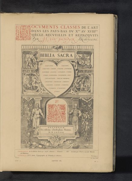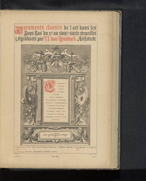 This is a reproduction of a title page with nautical instruments by Johannes van Doetecum. The monochromatic print presents a symmetrical composition dominated by a central, ornate structure resembling a monument. Figures stand guard on either side, flanking a text-filled plaque, with navigational instruments floating above, creating a visually dense space that speaks to the era's obsession with cartography and exploration. The design uses line work to create depth and texture; notice the fine, intricate details of the ship at the base. This title page doesn't merely announce content; it acts as a semiotic gateway. The inclusion of navigational tools, like astrolabes and compasses, points to a cultural code of discovery and scientific ambition. The formal arrangement suggests an ordered view of the world, yet the elaborate decoration hints at the complexities within. The visual vocabulary constructs an image that transcends its practical function. It invites us to consider how knowledge and exploration were framed and understood at the time.
