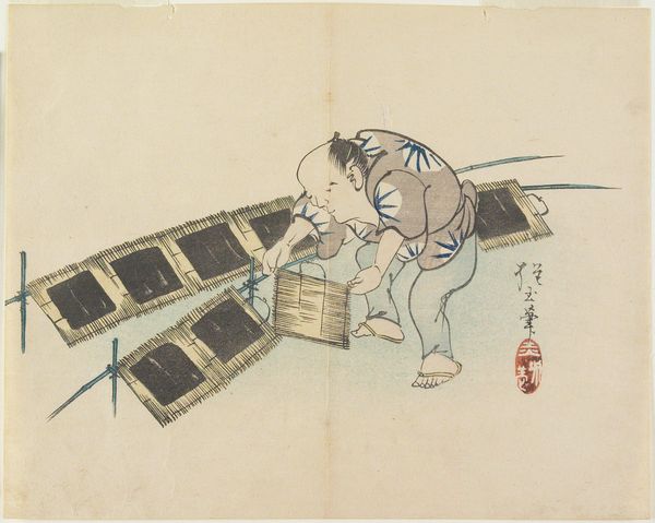 Curator: What a charmer! I feel as though I've just stumbled upon a candid moment, full of quirks and quiet contemplation. Editor: Indeed. What we’re looking at is "Momotarō Using a Fan," a print by Yamada Hōgyoku from the 1830s, currently residing at the Minneapolis Institute of Art. As an ukiyo-e piece, it participates in a broader visual language that encoded social commentary. Curator: Ukiyo-e...ah, the floating world! Does this fellow look like he’s floating to you? There's a stillness about him. What is he thinking, holding not one, but *two* fans? One’s plain, the other quite decorative, and above his head is an odd cartouche bearing a peach. What is he up to? Editor: Momotarō, our figure, is a popular character in Japanese folklore, typically born from a peach, which perhaps explains that visual reference! He’s a symbol of youth, courage, and overcoming adversity. In the Edo period, depictions of Momotarō circulated as symbols of resistance, cloaked with layered, nuanced meanings that addressed censorship laws of the period. Curator: Ah, so there is more than meets the eye. And I suppose that sword strapped to his back isn't merely decorative, but perhaps symbolic of those acts of resistance. Now, knowing a bit more about him makes that initial, calm demeanor all the more intriguing. The artist cleverly juxtaposes elements of peaceful reflection and underlying strength. Don't you think? Editor: It is this interplay, so often at play in Ukiyo-e prints, that really captures the socio-political environment, infusing the artwork with layered symbolism to promote critical thinking in a period that resisted overt calls for political resistance. This is something we should carry with us as we observe the work, paying close attention to these figures, even when they present a façade of harmony and inner peace. Curator: Right you are! It seems like even in stillness, stories can simmer. It makes you wonder what hidden depths we miss in our own encounters, doesn’t it? Editor: Precisely. It encourages us to consider that visual serenity often masks much more complex social dynamics. The artist provides a snapshot, and leaves us with open questions.
