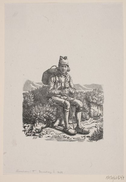 Editor: This is a print from around 1900, depicting Imogen from Shakespeare’s Cymbeline. She’s hunched over, clutching a sword, looking pretty dejected. There’s a definite air of melancholy about it. What first strikes you when you look at this piece? Curator: It’s a poignant visual reduction of Imogen’s psychological state. The sword she’s holding is not necessarily a symbol of violence here. Rather, consider the phallic sword, usually a sign of male virility and strength – is it a clue to her assumed identity and loss? The weight of the object contributes to the figure’s slump. It signifies the burden she bears in this act. Editor: That’s interesting – I was so focused on the sadness, I missed that potential reading of the sword as a stand-in for masculine identity. Curator: Yes, exactly. Think about the other cultural symbolism present, such as the historical Roman garment: does her cross-dressing imply deeper, unacknowledged conflicts within herself, outside patriarchal constraints? Also consider how these external and visible markers were understood, both in Shakespeare’s time, and again around 1900. Editor: So, you're suggesting the artist used costume and posture to speak to Imogen’s internal turmoil, not just the plot of the play? Curator: Precisely. The external narrative is well-known. Here, the image lingers instead on internal conflict and hidden tensions surrounding sexual identity using familiar symbolic shorthands of its time. What do you make of the landscape elements in this reading? Editor: That's a good point. The unkempt patch of land that she's standing on also suggests isolation and unease. Seeing the character in the drama as part of a larger cultural context of evolving ideas of sexuality really helps me understand it. Curator: Indeed. By focusing on enduring, recognizable symbolic elements, we gain insight into historical identity as more than the product of individual decisions. Editor: Thank you for sharing; I definitely see much more now.