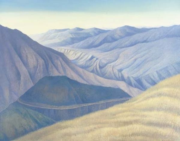 Curator: Here we have Carlos Orozco Romero’s "Las Montañas," an oil painting depicting a mountain range. There isn’t an exact date for this work, but we believe it to be from the mid-20th century. What are your initial impressions? Editor: It's strangely calming, almost melancholic. The muted palette and vast, empty landscape evoke a sense of solitude and perhaps even the insignificance of humankind in the face of nature. There's a tangible stillness to it. Curator: The absence of human presence is indeed striking, and I would argue quite deliberate. I see a statement about land and ownership in the Americas, about nature prior to colonial impositions. Who is using the land? What are their claims to it? It challenges narratives of progress that glorify man's supposed conquest of nature. Editor: I appreciate that interpretation. From my perspective, it also brings attention to the labor inherent in its creation. You can almost feel the texture of the brushstrokes, and understand how paint was handled and manipulated. I think it speaks to the physicality involved, the human effort needed to produce it, which seems so appropriate considering it depicts a mountainous range, built of literal Earth materials. Curator: Precisely! And even the muted colors feel deliberate; there is an intersectional narrative that goes unsaid that the labor for working the land falls along lines of race and social standing in Latin America. The way the paint is applied serves to highlight the sociopolitical structures inherent in landscapes. Editor: Yes, but let's not dismiss its pure aesthetic value! The interplay of light and shadow creates a subtle dynamism, making the landscape seem almost alive despite its apparent stillness. I can feel the weight of the materials in front of me and the weight of those materials, which in this case make up the mountain ranges represented. Curator: Agreed. The beauty invites contemplation, prompting critical inquiry into the power structures and historical forces embedded within that visual appeal. Editor: Ultimately, this painting, despite its simple subject matter, encourages us to appreciate both the aesthetic quality that can be achieved through oil paints, while also understanding the land itself as material—as something we have transformed but do not wholly possess.
