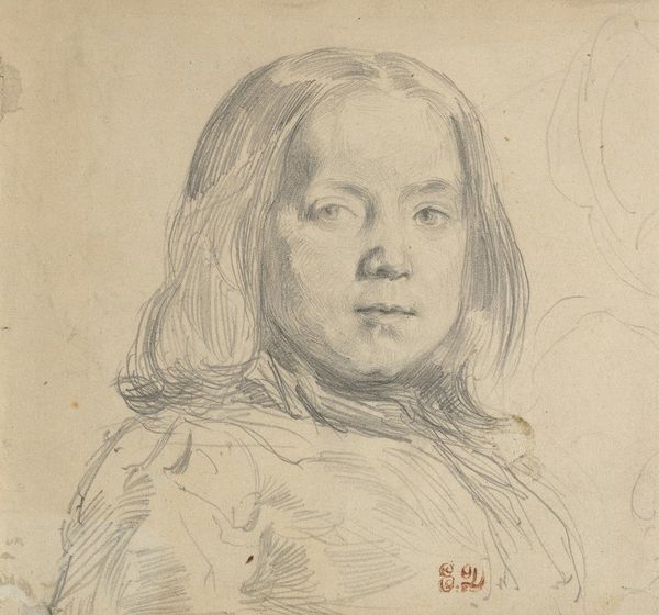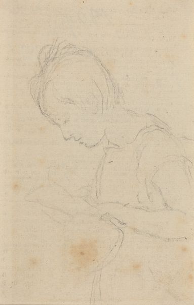Curator: Here we have William Henry Hunt's "Head of a Young Man, Looking Down," part of the Tate Collections. It's a small work, just 80 by 90 millimeters. Editor: What strikes me is the quiet melancholy. The downward gaze, the soft shading...it feels like a stolen moment of introspection. Curator: It does invite contemplation. Hunt, born in 1790, was working in a period of significant social upheaval. I think there's a case to be made that this quiet vulnerability reflects anxieties about shifting power dynamics. Editor: Perhaps, or maybe it's just a young man lost in thought! I mean, the loose sketching has a real immediacy. You can almost feel the artist capturing a fleeting emotion. Curator: I see your point. The raw quality certainly adds to its intimacy, its appeal. Editor: Absolutely. It’s a reminder that even in the midst of grand narratives, there’s always room for the personal, the delicate, the unresolved. Curator: A beautifully ambiguous piece, allowing for endless interpretations.