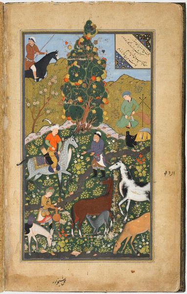 Curator: This is a piece called "Majnun in the Wilderness," a folio from an album signed by Ruhani. The artwork is held at the Harvard Art Museums. Editor: Wow, what strikes me first is the sheer abundance of animals, all coexisting almost peacefully. It’s like a miniature, illuminated Eden. Curator: It's interesting to consider the context. Majnun, a figure from Persian and Sufi literature, is driven mad by love, and finds solace in the natural world. Notice how Ruhani depicts the landscape as both a refuge and a reflection of Majnun’s internal chaos. Editor: Right, the material reality then becomes one of self-imposed exile. The gold detailing, the lapis lazuli—these precious materials speak to the wealth and labor involved in its production, quite a contrast to Majnun's voluntary poverty. Curator: It's as if the very artifice of the painting underscores the raw, untamed emotions at its heart. Ruhani's hand seems to disappear, allowing us to enter Majnun’s world of love and loss. Editor: The detail in the animals, even the border design—it all adds up. What a commentary on devotion, both to artmaking and the pursuit of love. I’m going to need to sit with this one.