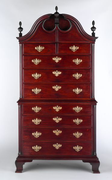Editor: This High Chest of Drawers, crafted anonymously between 1750 and 1770, is currently housed at the Art Institute of Chicago. Its wooden structure and decorative style make it an intriguing object. It seems very proper. What kind of symbolism can we find here? Curator: It's a fascinating object, isn't it? To me, these chests represent more than mere storage. They symbolize aspiration, upward mobility even. Notice the towering height – a physical manifestation of reaching for something higher. The elaborate carving, while subtle, suggests wealth and refined taste, ideals of the era. Does the brass hardware remind you of something else? Editor: Hmm, the handles, the little flourishes almost look like stylized flowers or leaves. What could that suggest? Curator: Exactly! They point to an enduring connection with nature and fertility. Think of these objects existing in homes: chests safeguarded personal belongings, representing the private, domestic sphere – and they reflect aspirations, connections to a desired idealized nature, and wealth. Does this connection inform your impression? Editor: Yes, now it seems less about stuffy formality and more about someone's hopes and dreams for a better life expressed through the objects they owned. So even a piece of furniture holds its own symbolic world? Curator: Precisely! Every detail—the wood, the shape, the hardware—contributes to a story far beyond functionality, embedded with societal ideals and individual longings. Editor: I see it in a whole new light now! It’s a great peek into the past! Thanks!