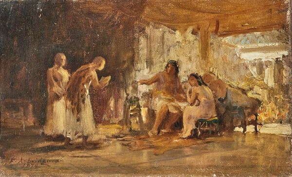 Edward Mitchell Bannister painted "Salome Receiving the Head of John the Baptist" in 1890, using oil on canvas. The earthy, muted tones give the scene a somber, almost claustrophobic atmosphere, emphasized by the composition's density. The weight of the narrative—Salome's infamous request—is visually palpable. Bannister's brushwork, though not invisible, blends forms, creating a sense of veiled meaning. This blurring challenges traditional, clear-cut interpretations, inviting viewers to question the moral and psychological states of the figures involved. The subdued palette and textured application of paint serve to destabilize any heroic or celebratory reading of the event, engaging with the darker aspects of human desire and consequence. Bannister's formal choices encourage us to see beyond the surface drama and delve into the complex interplay of power, sensuality, and mortality.