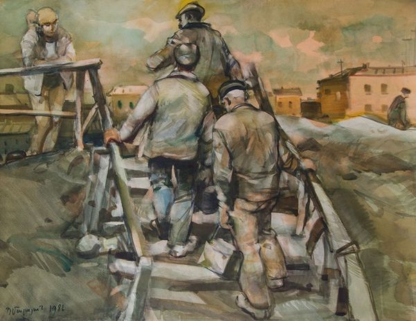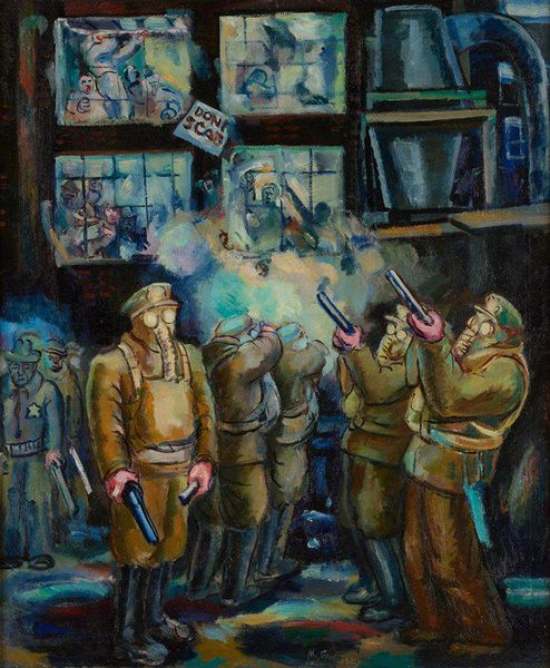 Editor: Salman Toor’s "The Smokers," painted in 2018 with oils, presents such a vivid snapshot of contemporary life. I’m struck by the contrast between the warm tones of the central group and the cool blues of what seems like a street scene in the background. What can you tell me about what’s happening here? Curator: The layering of visual spaces intrigues me. Observe how the 'smokers,' bathed in the interior's warm glow, exist almost separately from the figures on the street, watched over by what looks like a police officer. The cigarette, that slender object held by each figure, becomes a potent symbol. What does smoking, traditionally, represent to you? Editor: Relaxation? Rebellion, maybe? It definitely marks a certain type of social gathering. Curator: Precisely. Consider how Toor employs it. It becomes a contemporary 'communion' of sorts. These aren't isolated figures; they are linked by a shared act, a ritual almost. Notice how this everyday habit acts as a bridge. The shared cigarette is the thread between alienation and belonging in urban existence, connecting them while highlighting the subtle complexities of cultural assimilation and social performance, wouldn't you agree? Editor: I never considered the cigarette as something more than just… well, a cigarette. It's like Toor uses it to connect these men to each other, despite whatever other differences may exist. Thank you! Curator: And I find fresh insight in your observations! Viewing art is, after all, a collaborative process. The dialogue between our perspectives is what ultimately reveals deeper meaning.
