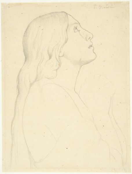 Otto Scholderer created this pencil drawing, titled 'Head of a Girl in Profile to the Left', in 1860. Scholderer, living through a time of significant social change, navigated his artistic practice amidst traditional expectations and emerging modern perspectives. This delicate sketch invites us to consider the representation of young women in 19th-century art. While Scholderer was associated with the Realist movement, known for its focus on everyday subjects, there is a sense of idealization in this portrait. The girl's refined features and serene expression could be seen as upholding conventional standards of beauty and femininity. Yet, the unfinished quality of the drawing hints at a certain vulnerability, a glimpse behind the facade of idealized womanhood. What does it mean to capture a young woman's likeness, and what power dynamics are at play? This drawing acts as a subtle reflection on the societal roles and expectations placed upon women during Scholderer's time.