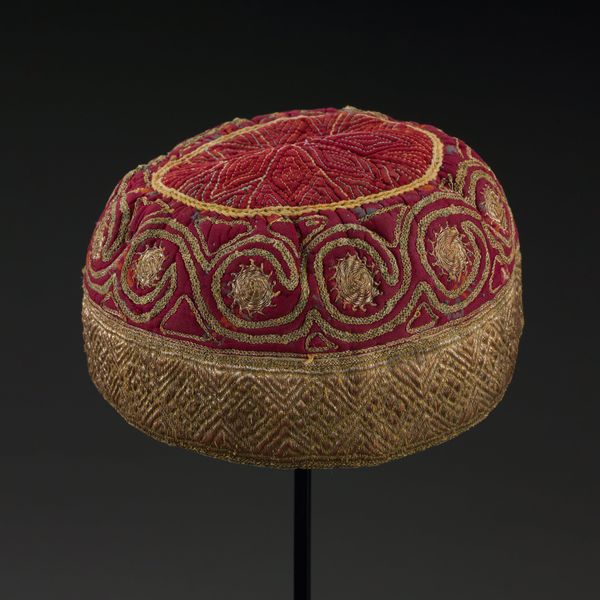 Curator: Take a look at this striking “Man’s Hat” dating from the 20th century. It's an intriguing piece from our textile collection. The artist is, as yet, unknown, but it's clear they were incredibly skilled. The piece is made of wool and, overall, it feels like an excellent specimen of decorative art. Editor: My first impression is of intense, concentrated energy! It is vibrant and meticulous. There's so much detail crammed into such a small space; it almost feels claustrophobic but in a captivating way. Does the density of its design hold any symbolic weight? Curator: That's a fantastic question! The patterns and colors may represent specific cultural narratives, kinship ties, or even spiritual beliefs. Certain shapes could act as amulets, wards against ill fortune or expressions of status and identity. The repeated paisley motifs for example... do they invoke a particular cultural memory for you? Editor: The paisleys definitely hint at distant lands, maybe India or Persia, evoking tales of silk roads and exotic spices. Seeing it sparks a curiosity and wonder and prompts me to think of my own journeys and cultural encounters, a little souvenir of imagination perhaps. Do the colors themselves, the striking yellow and deep blue, signify something particular? Curator: Colors certainly possess their own symbolic languages. In some traditions, yellow embodies prosperity, joy, and intellect. While blue might signify calmness, spirituality, or even protection against the "evil eye." In its cultural context, understanding color association could reveal complex symbolic nuances within this hat. Editor: It's like wearing a story, isn't it? Imagine the artisan who carefully embroidered each stitch, imbuing it with meaning. There is so much contained in such a humble object! Thank you, I’m now wondering where this piece might next carry me... Curator: Indeed, it is a quiet testament to cultural expression and continuity across generations. It's a privilege to hold these stories in trust.