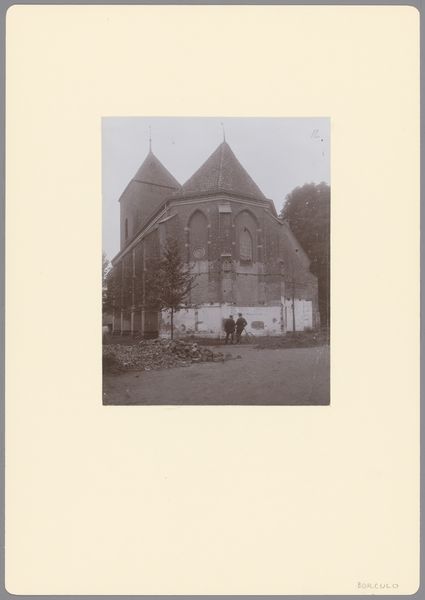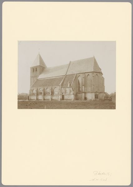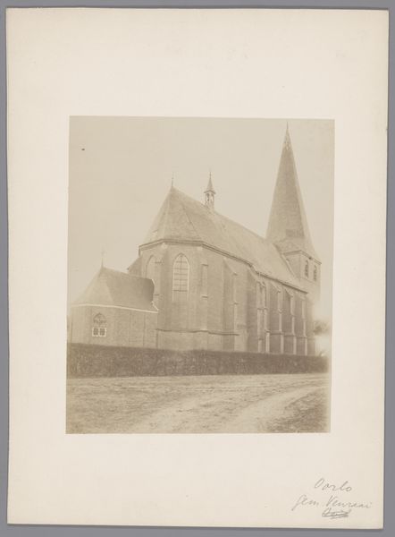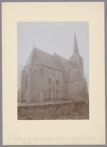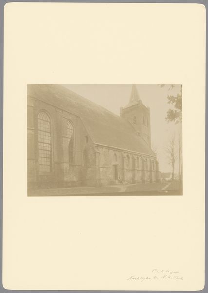 Editor: This photograph, taken in 1908, shows the former Catholic Church in Horssen. The anonymity surrounding its creation makes me wonder, what exactly was being documented here? What do you see in this piece? Curator: For me, this image isn't solely about architectural representation, it's about production. Look at the paper quality; that sepia tone. It indicates specific chemical processes, developed and refined during this period. What can you tell me about the surface texture? Editor: It looks like a standard matte photographic print, perhaps? What's the significance? Curator: Exactly. The 'standardization' is important. It represents a shift in photographic production. How many of these images would need to be produced? This wasn't 'high art' but about creating multiples, easily distributed and used within, presumably, the governmental record keeping sector. Editor: So, the focus wasn't on individual artistry, but about reproducible documentation. The photograph serves as a tool. Curator: Precisely. We should consider what photographic practices served the growth of civic institutions. What impact would it have if someone were not granted these advantages? The physical object represents accessible information... for some. Editor: I never thought about photography this way – considering the physical components, production and what that implies about access. Thank you! Curator: Likewise. Considering art through the lens of materiality helps uncover layers easily overlooked.
