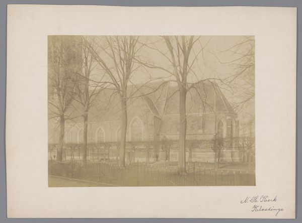 This photograph captures the Zuidgevel van de Geerteskerk te Kloetinge. The anonymous photographer, working for Monumentenzorg, presents a composition dominated by vertical lines and muted tones. The skeletal trees in the foreground, stark against the pale stone of the church, create a layered effect, drawing the eye through the scene. The photograph's structure invites a semiotic reading, where the bare trees might symbolize the austerity of faith or the passage of time, contrasting with the enduring architecture of the church. This play of elements encourages viewers to question fixed meanings, engaging with the photograph not merely as a representation of a place but as a meditation on history, perception, and the dialogue between nature and the built environment. The restricted palette of browns and grays, coupled with the photograph's grainy texture, lends a sense of timelessness. It is through this interplay of formal elements that the photographer prompts a deeper reflection on cultural memory and the ways in which we construct meaning from the world around us.