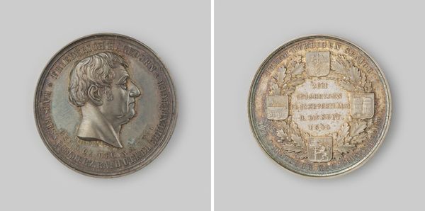 Editor: This bronze piece is a commemorative medal from 1839 depicting Alexandre Gendebien, a member of the Chamber of Representatives. I understand it was created by Adrien Hippolyte Veyrat. The texture gives the piece an aura of importance, though, at the same time, it has a feeling of constraint; it's almost like a political mugshot on a coin! What visual elements stand out to you? Curator: The stark profile, for one, showcases a clear emphasis on line and form, drawing inspiration, certainly, from Neoclassical portraiture. Observe how the smooth, uninterrupted surface of the field sharply contrasts the textured hair and inscription, drawing attention to the symbolic weight of the image, imbuing it with the importance you identified at first. This opposition contributes a visual tension—between the individual and the state—if one views the perimeter text as representing the larger forces impacting upon a political figure. Does that add to your sense of constraint? Editor: It does! The framing effect amplifies that sense. But what about the coat of arms on the reverse side of the medal? How does that contribute formally? Curator: The symmetry of the coat of arms echoes the controlled aesthetic of Neoclassicism. The heraldic devices themselves function as a semiotic system, representing political power and allegiance, reflecting on the very reasons the person in the profile was being honored by this particular area. The composition of each side serves to formalize what otherwise could just be a thank you note. Editor: So, by focusing on composition and form, the artist creates a work that's less about the individual and more about the underlying structures of power and representation. I will not look at any more coins in the same way. Thank you! Curator: Precisely. Hopefully you are more open to seeing how formal aspects are also a vital part of their symbolic meanings.