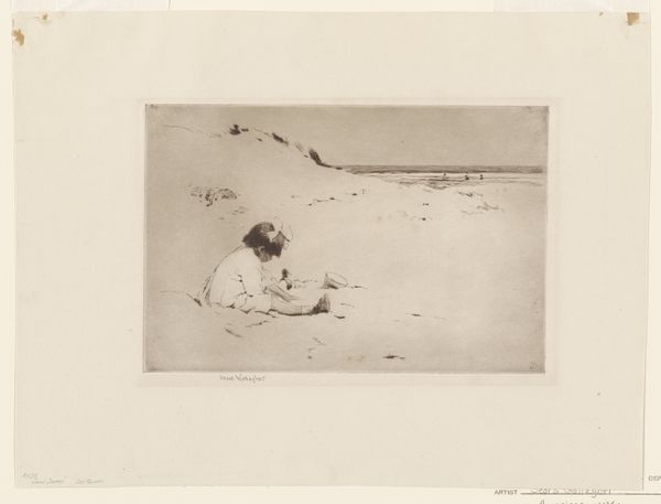 Editor: This etching from the 1880s by Carl Bloch, titled "Vrouw en meisje in duinen", or "Woman and girl in the dunes", has such a lovely quiet mood. I'm really struck by how much texture he manages to achieve with, I think, just ink and paper. What's your take on this? Curator: I see this etching as a record of labor, particularly female labor, embedded within the landscape. Consider the materials: etching, a process inherently about replication and distribution. Paper, once meticulously handmade, then industrially produced. What tasks do we think the woman and girl were occupied with? Was it recreational or were they involved with, say, the local textile industry using the dunes’ resources? Editor: I hadn't thought of the dunes themselves as a resource, good point. But it also feels very...personal. Like a glimpse into someone’s private time. Curator: And how is this ‘personal’ experience shaped by, and in turn shaping, the broader social and economic context? Consider their clothing: likely made from textiles dependent on complex trade routes and labor systems. The "intimacy" is a construct as much as it is a "feeling." Can we extract what these subjects were experiencing, or are we seeing Bloch, the artist, mediating how labor is performed in this slice of 1880s life? Editor: So you're saying even a simple scene of a woman and child is tied to these massive systems of production? Curator: Precisely. Every mark on that paper, every line etched, speaks to the larger world of making and consuming. Consider the societal labor necessary to render them a commodity. Editor: I guess I was mostly reacting to the overall impression of leisure and calm, and not thinking about the material circumstances. Curator: But the beauty, or 'calm' as you describe it, can also draw us into thinking more carefully about those circumstances. Maybe it's the artist subtly inviting us to consider it more critically. Editor: Okay, that makes sense. It definitely changes how I'll look at similar art pieces from now on! Thanks for that.