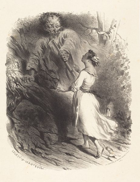 Editor: This is Honoré Daumier’s 1847 lithograph, “Une Imitation bourgeoise du Zéphir de Prudhon.” It looks like a funny take on romantic painting, kind of deflating that dramatic style. What do you make of this parody? Curator: It's a wonderful example of how Daumier uses his art for social commentary. The title itself points to this, no? We see the aspirations of the bourgeoisie to emulate the grace of the aristocracy and of Neoclassical art – Prudhon’s Zephyr, specifically – but they can only achieve a clumsy imitation. Editor: That makes sense. He's not just poking fun at the style, but at a particular class trying to adopt that style, and failing. Curator: Exactly. Consider the political landscape of France at the time, shortly before the 1848 Revolution. Daumier often used caricature to critique the bourgeoisie, whose power was rising, but whose values, he suggested, were shallow and imitative. The location too contributes, no? The public park as the site of performance. What do you see there? Editor: I see how their "romantic" scene plays out in public – her discomfort, his ham-fisted gesture – turning high art into a comedic public display. Curator: Precisely. And in its day, prints like this circulated widely. Daumier's work wasn't confined to elite galleries; it engaged directly with public opinion, influencing social discourse. Editor: It makes you think about how art can be a form of political speech, especially when it's so accessible. It sounds like Daumier questioned the very idea of who art is for, right? Curator: Absolutely. Daumier highlights how art is intertwined with social identity and power dynamics. And asks who is allowed to partake of it. Editor: That adds a whole new layer to understanding Daumier's intention! Thanks! Curator: It's fascinating how a single image can reveal so much about the politics of its time. Thanks for sharing.